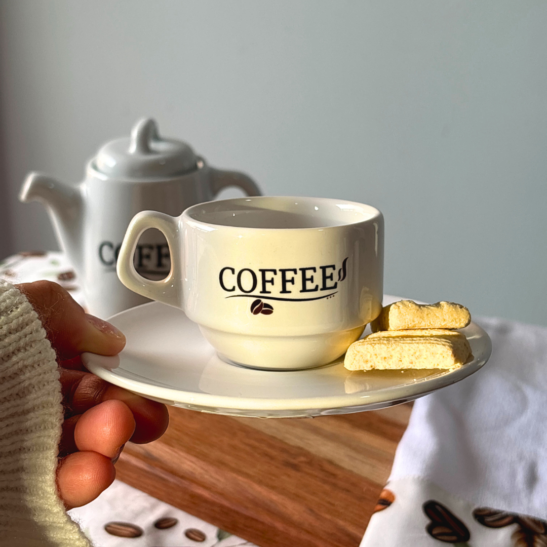 A Xícara Coffee faz parte de uma coleção exclusiva criada para quem valoriza o ritual do café e os detalhes que tornam o dia mais especial. Com design clássico e minimalista, ela traz a escrita Coffee em uma composição elegante e atemporal, perfeita para compor mesas postas, cantinhos do café ou presentear.